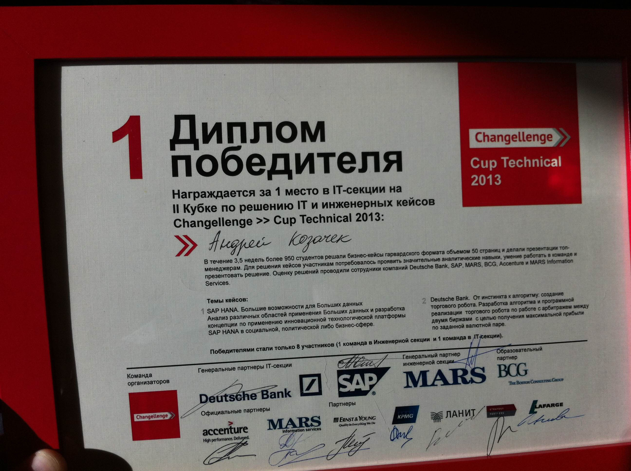 8 апреля Команда «Sharp Solution» Института информационных бизнес систем в составе магистрантов Козачка Андрея, Глашкиной Ксении, Карапузова Алексея и студента 1 курса кафедры ИБС МФТИ Лахтарина Сергея, заняла 1 место в IT-секции на Кубке по решению IT и инженерных кейсов Changellenge Cup Technical 2013.В течение 3,5 недель более 950 студентов решали бизнес-кейсы гарвардского формата объемом 50 страниц и делали презентации топ-менеджерам. Для решения кейсов участникам потребовалось проявить значительные аналитические навыки, умение работать в команде и презентовать решение.
