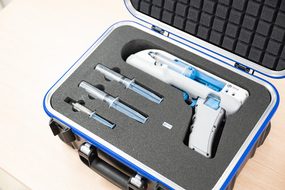 «В отличие от существующих мировых аналогов разработанное устройство является полностью автономным и питается от встроенных аккумуляторных батарей, которые могут быть заряжены через USB-порт, — рассказывает автор разработки Тимур Айдемир, к.т.н., инженер лаборатории тканевой инженерии и регенеративной медицины НИТУ МИСИС. — Перед работой два стандартных шприца объемом 20 мл заправляются биополимерами и медицинскими препаратами. Через специальный порт подсоединяется третий шприц и выполняется заправка устройства сшивающим агентом, далее заправляющий шприц отключается. При нажатии на курок ультразвуковая система одномоментно собирает все компоненты в области печати, тем самым формируя полимерный сшитый биоматериал, способный останавливать кровотечение и ускорять регенерацию ткани».