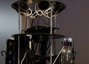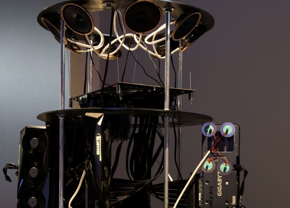 Третий проект от выпускника ArtTECH-2024 Александра Василенко «Хор графических процессов» визуализирует скрытый процесс обучения нейросетей. Компьютерные видеокарты, в режиме реального времени генерируют текст и обучают модель инсталляции. Работа устройств сопровождается звуком вентиляторов и теплом — этот технический шум становится частью аудиовизуального опыта. Проект раскрывает хрупкость и чувственность технологий, превращая вычисления в почти телесный процесс. Впервые инсталляция была реализована весной 2025 года в рамках сотрудничества Яндекс и Третьяковской галереи.